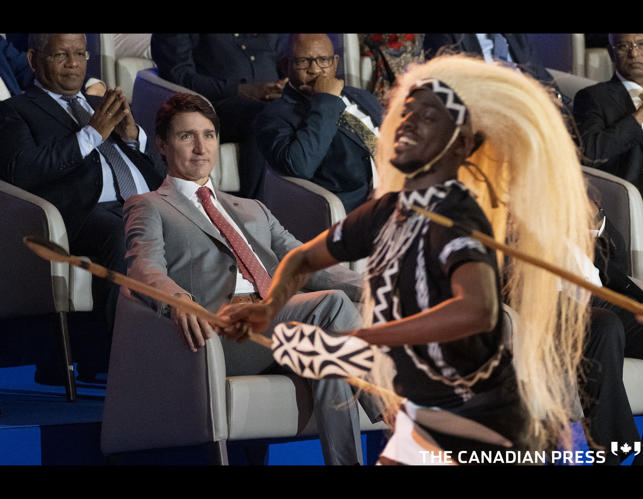 Prime Minister Justin Trudeau watches traditional dancers perform during the opening ceremony of the Commonwealth Heads of Government Meeting in Kigali, Rwanda on Friday, June 24, 2022. THE CANADIAN PRESS/Paul Chiasson