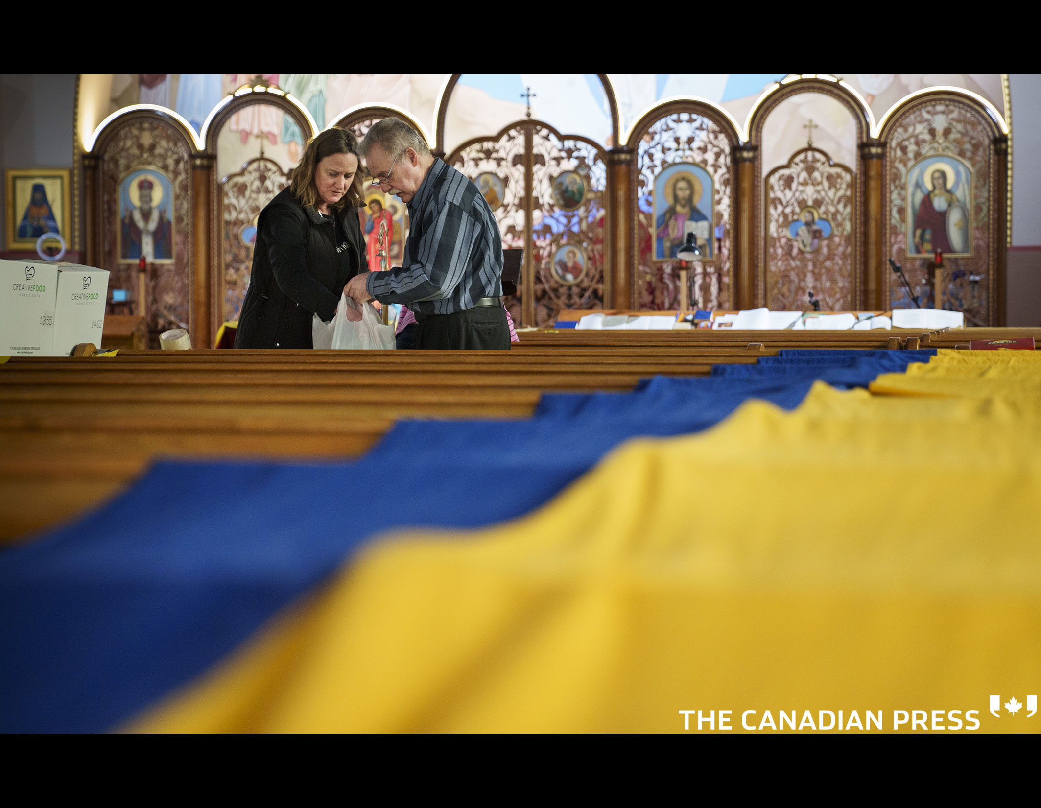 A volunteer sorts through donations destined to Ukraine with a large Ukrainian flag draped over the pews at the St. Michael's Ukrainian Catholic Church in Montreal on Friday, March 25, 2022. Most goods are destined for overseas while others are needed for refugees arriving in Montreal. THE CANADIAN PRESS/Paul Chiasson