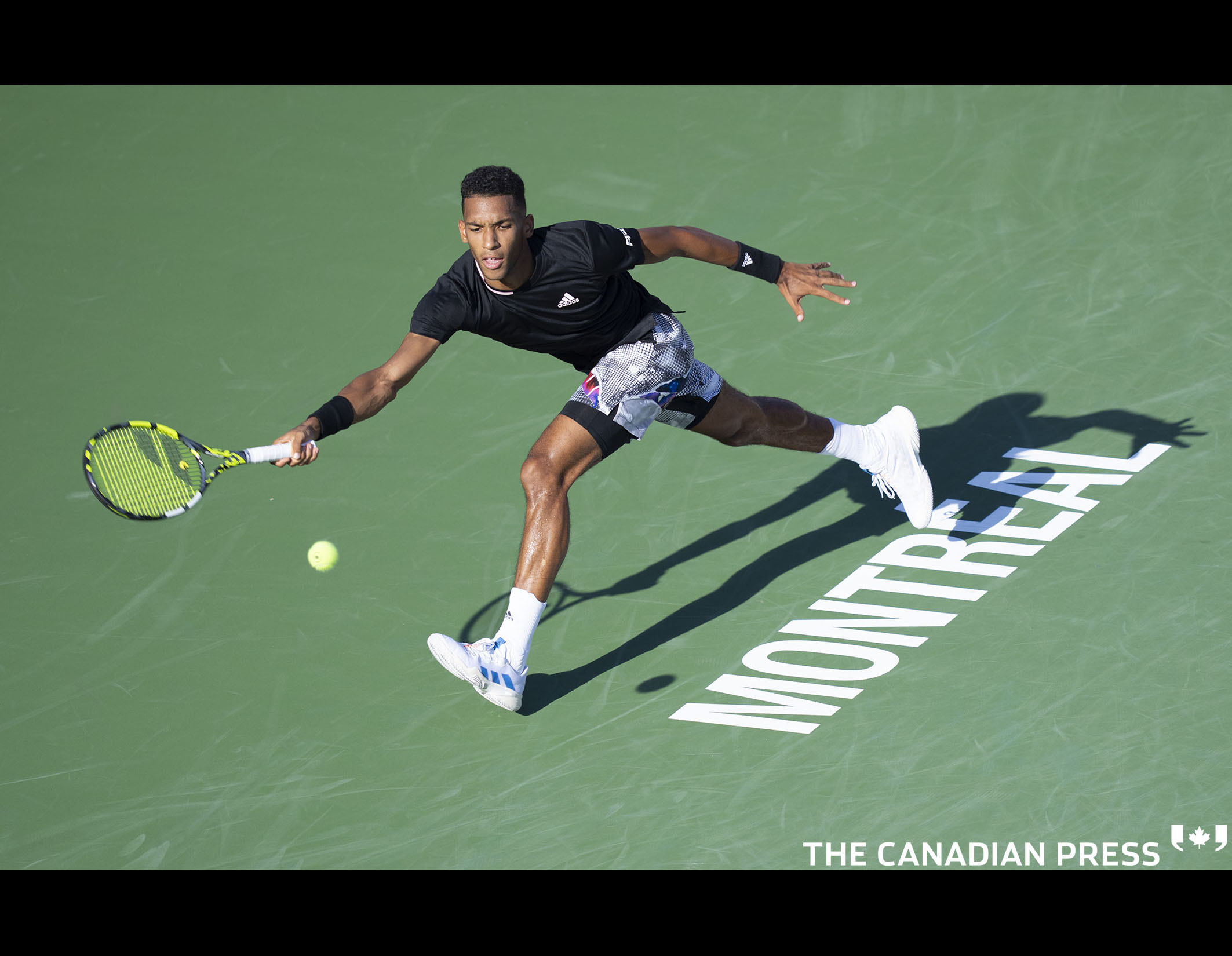 Canada’s Felix Auger-Aliassime lunges to return the ball to Cameron Norrie of Great Britain during round of sixteen play at the National Bank Open tennis tournament, Thursday, August 11, 2022 in Montreal. THE CANADIAN PRESS/Paul Chiasson