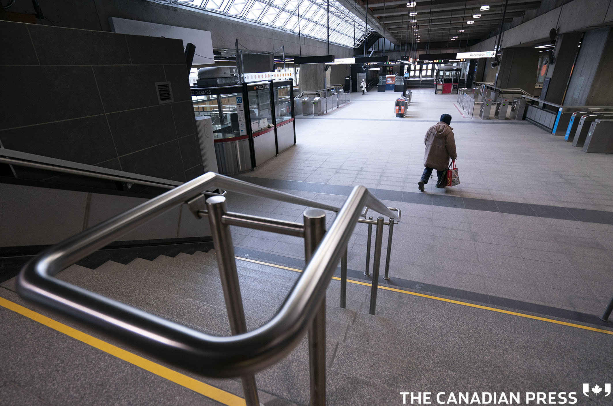 CDA Coronavirus 20200319 Published March 22, 2020 at 2126 × 1408 in CDA Coronavirus 20200319 A lone commuter enters a subway station in Montreal on Thursday, March 19, 2020. THE CANADIAN PRESS/Paul Chiasson