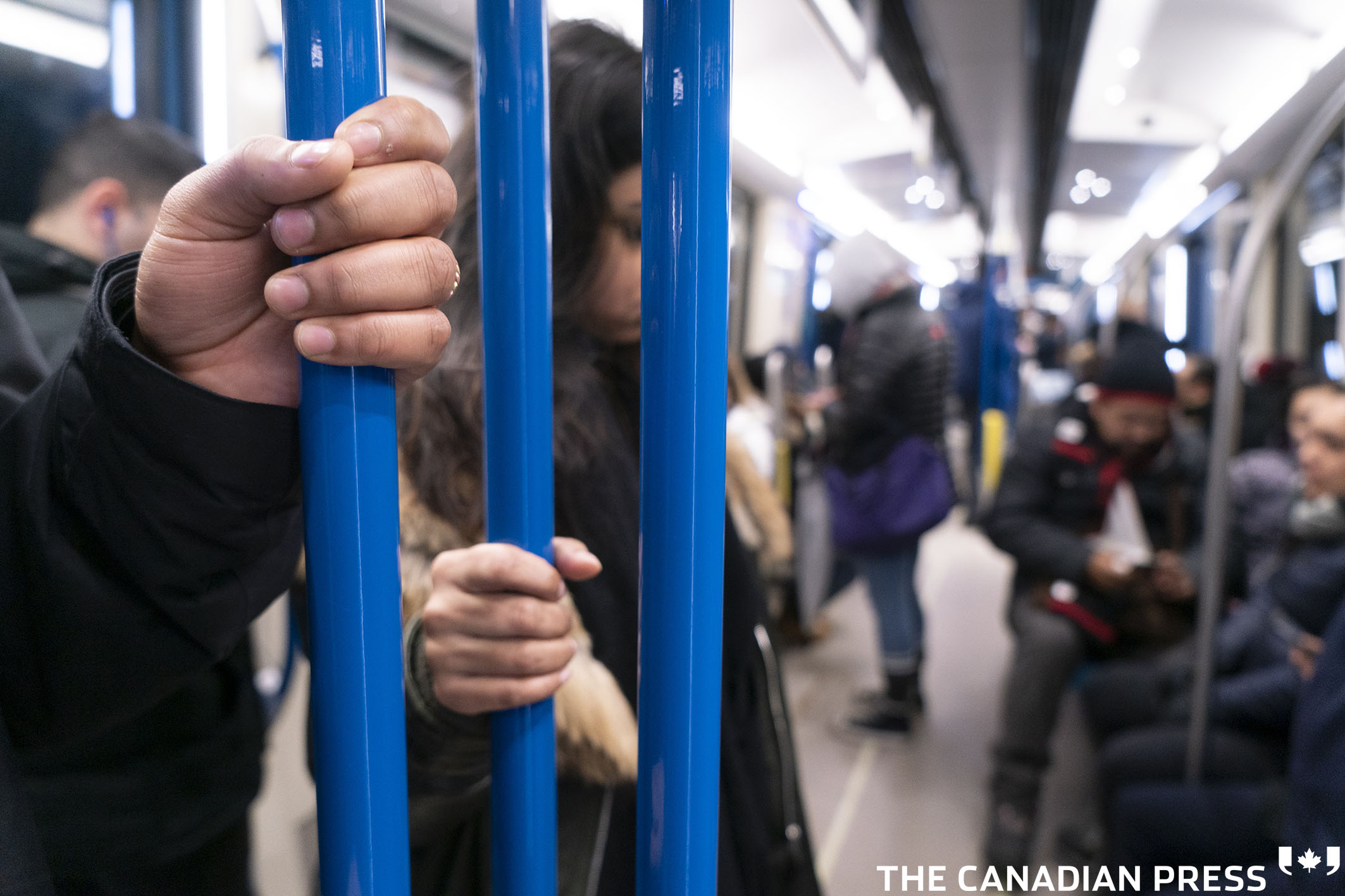 Coronavirus 20200313 Published March 22, 2020 at 2126 × 1417 in Coronavirus 20200313 Commuters hold the hand rail in a subway in Montreal on Friday, March 13, 2020. THE CANADIAN PRESS/Paul Chiasson