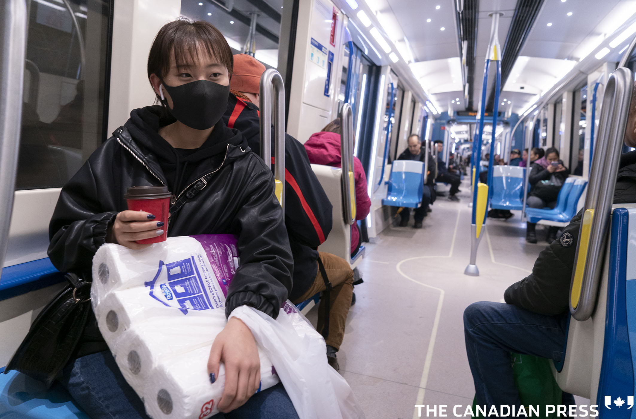 Coronavirus 20200313 Published March 22, 2020 at 2126 × 1403 in Coronavirus 20200313 A commuter wears a protective mask as she ride the subway in Montreal on Friday, March 13, 2020. THE CANADIAN PRESS/Paul Chiasson