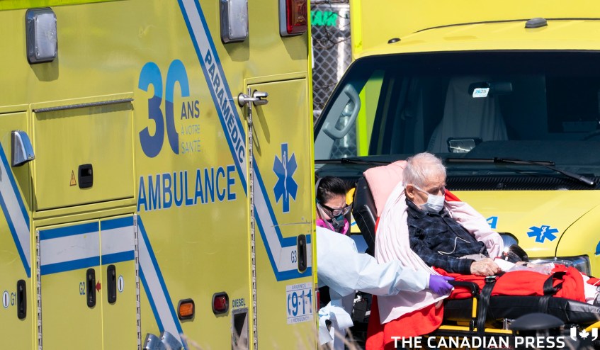 COVID Cda 20200406 Published April 11, 2020 at 2126 × 1240 in COVID Cda 20200406 A patient is wheeled to the emergency unit of the Verdun Hospital in Montreal, on Monday, April 6, 2020. THE CANADIAN PRESS/Paul Chiasson