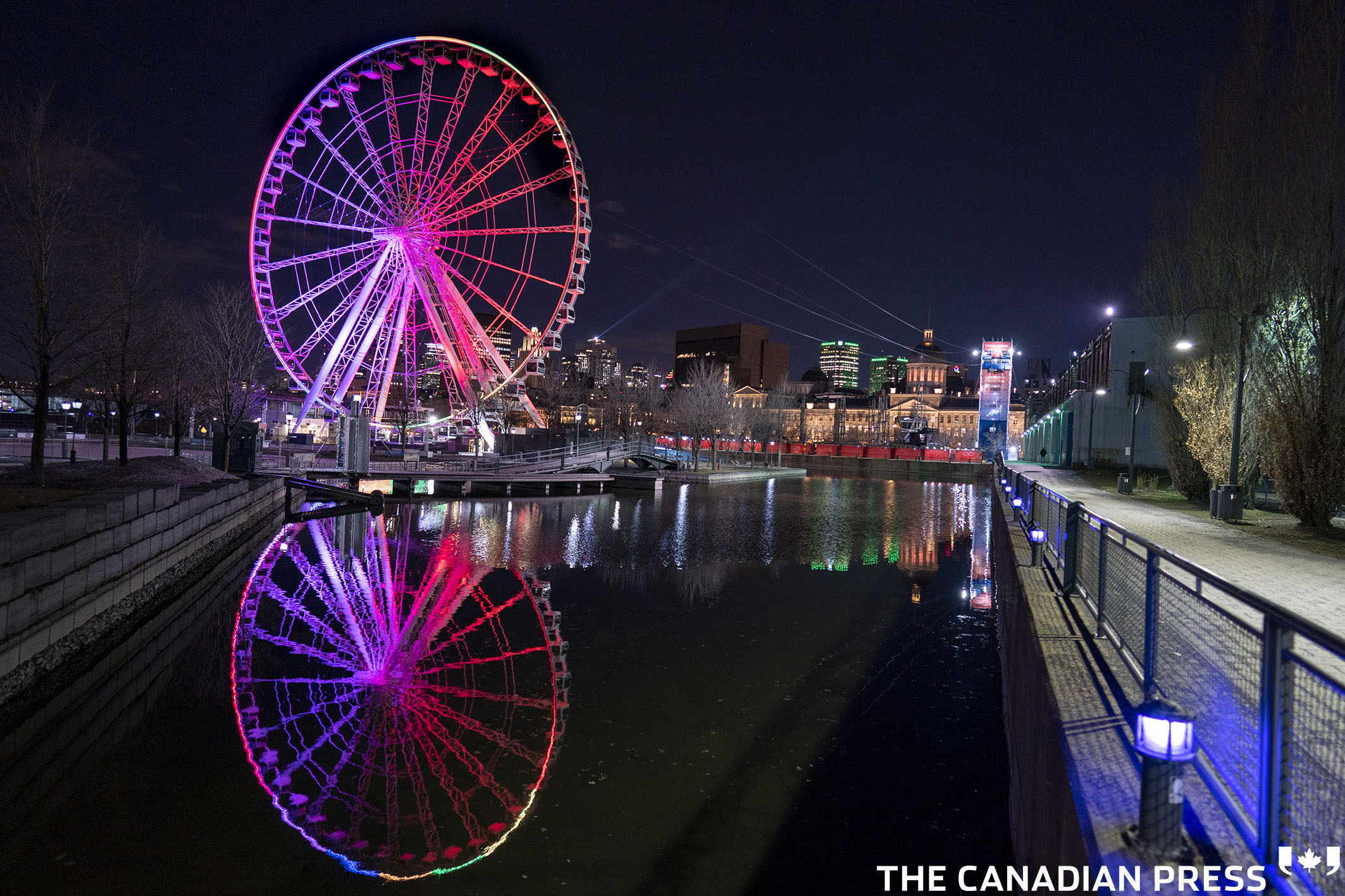 COVID Cda 20200406 Published April 11, 2020 at 2126 × 1417 in COVID Cda 20200406 The Ferris Wheel is lit to the colours of the rainbow in solidarity to healthcare workers in Montreal, on Monday, April 6, 2020. THE CANADIAN PRESS/Paul Chiasson