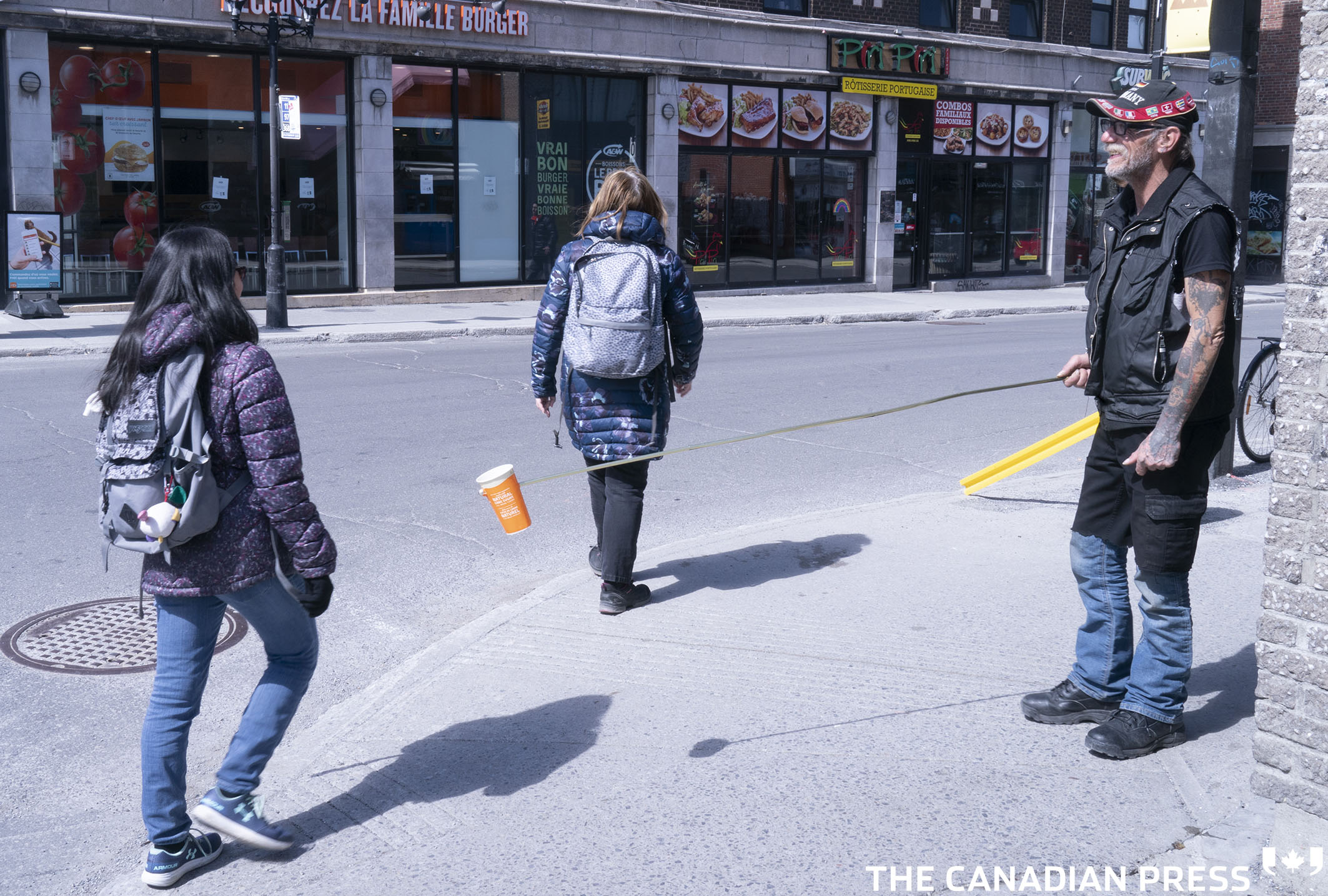 COVID Cda 20200408 Published April 11, 2020 at 2126 × 1435 in COVID Cda 20200408 Pierre, a homeless person, uses a perch to keep his distances from passersby as he panhandles on the streets of Montreal, on Wednesday, April 8, 2020. THE CANADIAN PRESS/Paul Chiasson