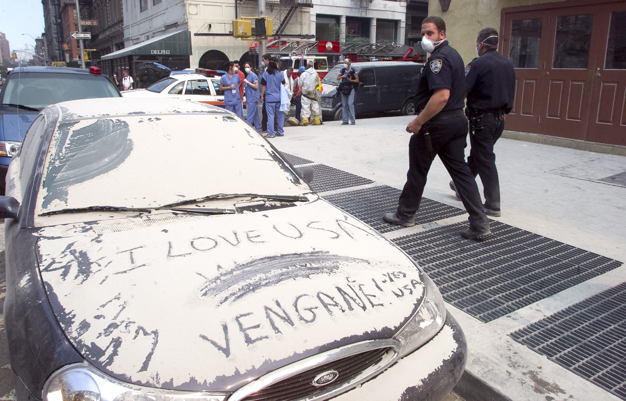 États Unis Published February 10, 2021 at 2000 × 1281 in États Unis TATS-UNIS Le lendemain matin du 11 septembre un message est inscrit dans la poussire sur le capot d’une voiture annonant le dbut d’une re nouvelle.