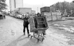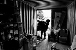 - With the help of a friend, a scavenged living room chair is wheeled back to the container.