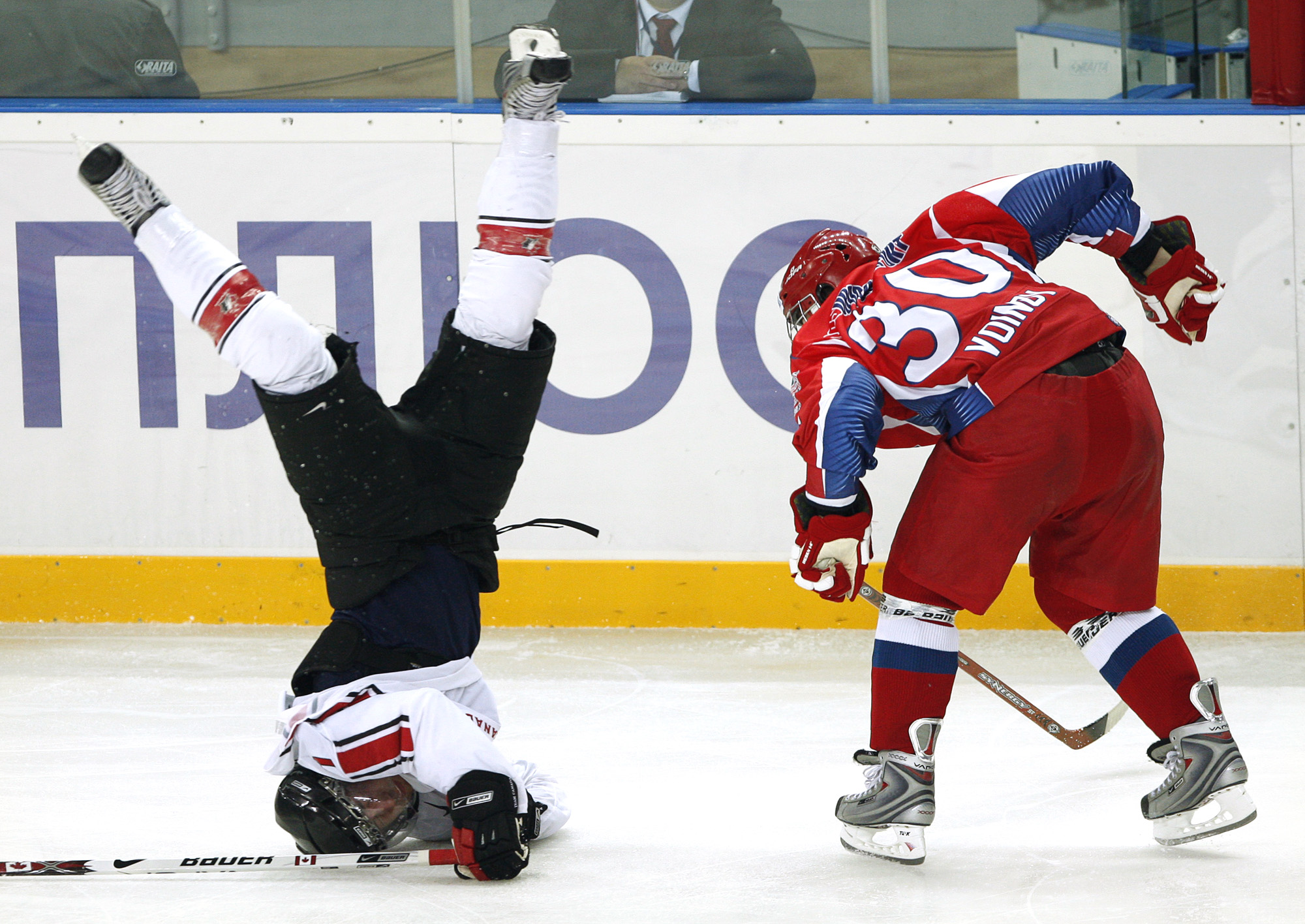 Russie Published February 10, 2021 at 2000 × 1416 in Russie RUSSIE Le joueur de lÕquipe Canada Sam Gagner fait une pirouette aprs tre frapp par Vyacheslav Voinov de l’quipe Russe Omsk. Les deux quipes juniors s’affrontaient lors d’un tournois remmorant la srie de 1972.